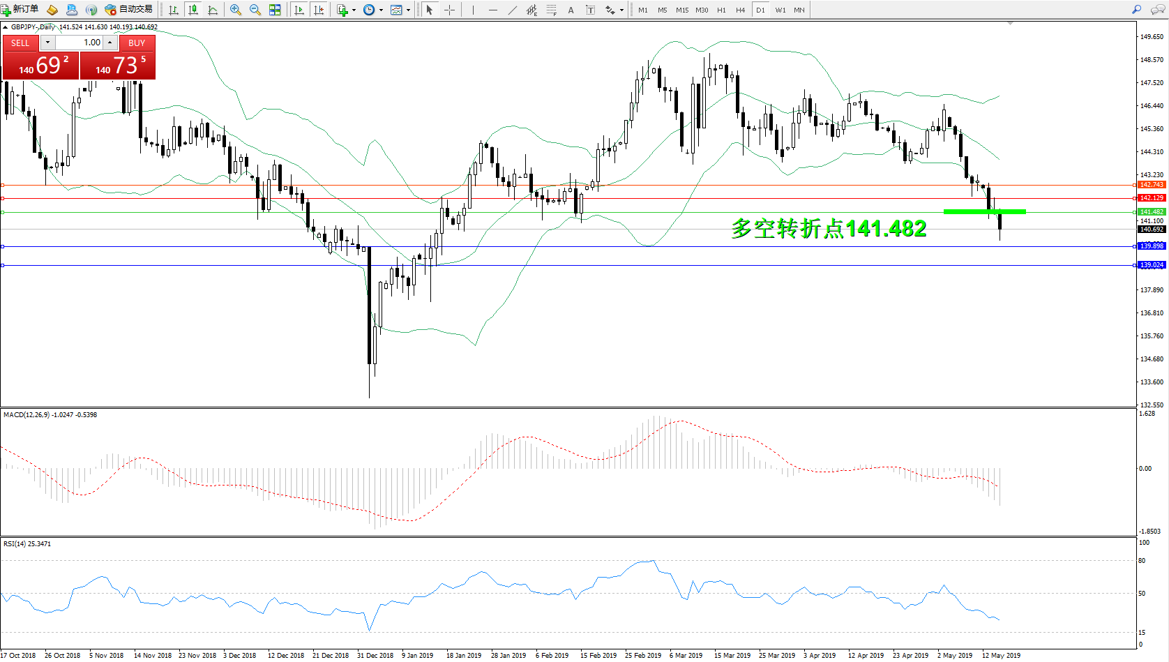 交易策略:141.482下方看跌,目标139.898、139.024