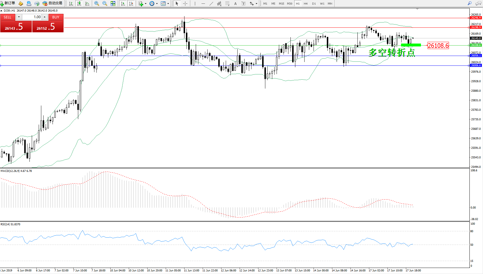 道琼斯指数DJ30—— 小时K线图显示: