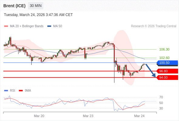 交易策略: 在 100.50 之下,看跌,目标价位为 96.80 ,然后为 94.00 。