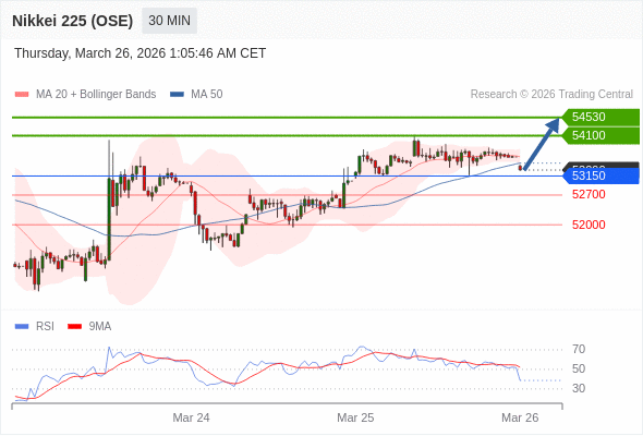 日经225股指期货 (OSE) 当日内: 在53150之上,看涨。