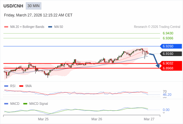 美元/人民币 当日内 : 逐渐下跌,当 6.9260 阻碍上行,则 6.8968 为目标位。