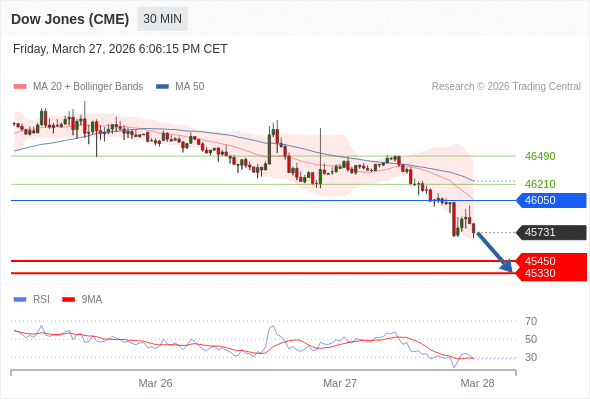 在 46050 之下,看跌,目标价位为 45450 ,然后为 45330 。
