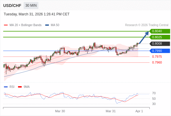 在 0.7990 之上,看涨,目标价位为 0.8025 ,然后为 0.8040 。