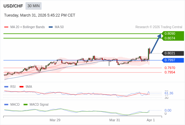 美元/瑞郎 当日内 : 看涨,当 0.7997 为支撑位。