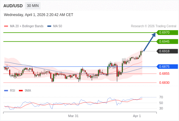 在 0.6875 之上,看涨,目标价位为 0.6945 ,然后为 0.6970 。