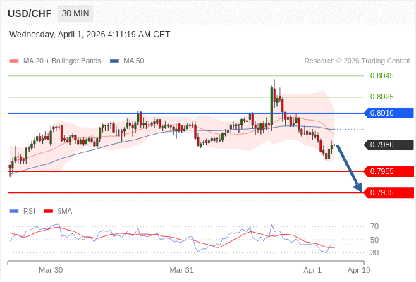 在 0.8010 之下,看跌,目标价位为 0.7955 ,然后为 0.7935 。