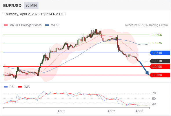在 1.1540 之下,看跌,目标价位为 1.1490 ,然后为 1.1460 。