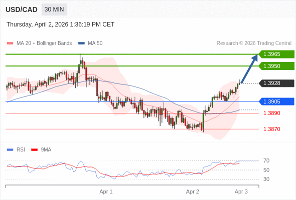 在 1.3905 之上,看涨,目标价位为 1.3950 ,然后为 1.3965 。