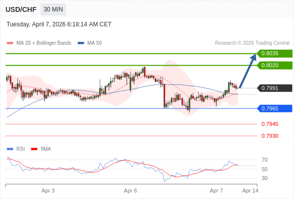 在 0.7965 之上,看涨,目标价位为 0.8020 ,然后为 0.8035 。
