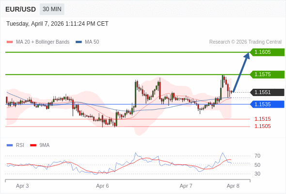 在 1.1535 之上,看涨,目标价位为 1.1575 ,然后为 1.1605 。