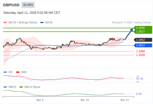 交易策略: 看涨,当 1.3417 为支撑位,目标定在1.3556。