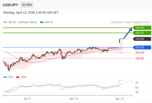 在 159.30 之上,看涨,目标价位为 160.15 ,然后为 160.45 。