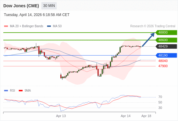 在 48190 之上,看涨,目标价位为 48600 ,然后为 48800 。