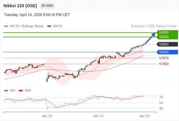 日经225股指期货 (OSE) 当日内: 在58300之上,看涨。