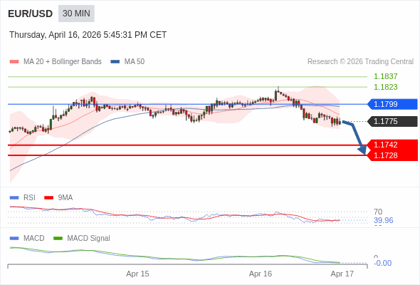 欧元/美元 当日内 : 看跌,在 1.1799 之下。