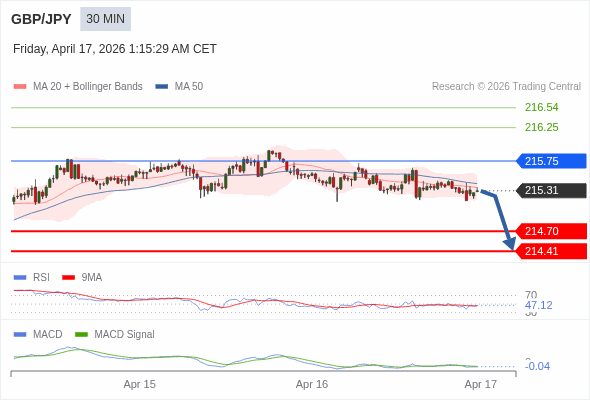 英镑/日元 当日内 : 看跌,在 215.75 之下。