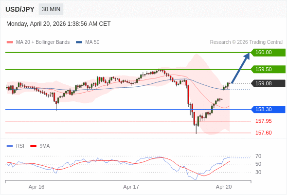 在 158.30 之上,看涨,目标价位为 159.50 ,然后为 160.00 。