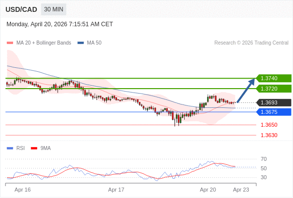 在 1.3675 之上,看涨,目标价位为 1.3720 ,然后为 1.3740 。