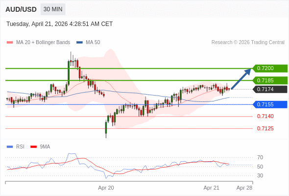 在 0.7155 之上,看涨,目标价位为 0.7185 ,然后为 0.7200 。