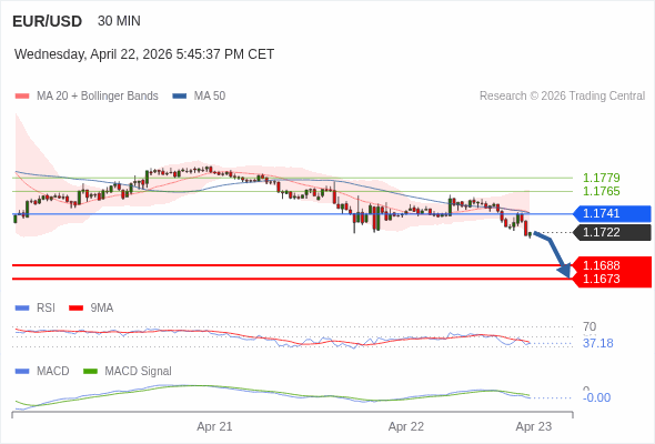 欧元/美元 当日内 : 看跌,在 1.1741 之下。