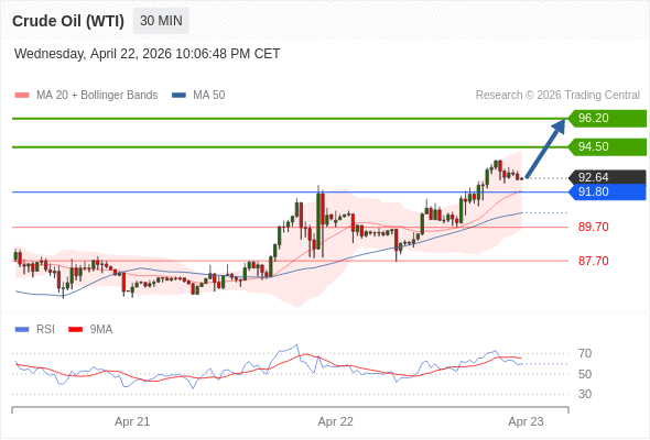 在 91.80 之上,看涨,目标价位为 94.50 ,然后为 96.20 。