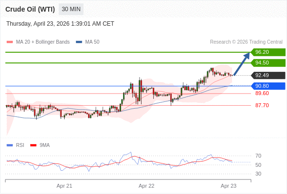 在 90.80 之上,看涨,目标价位为 94.50 ,然后为 96.20 。