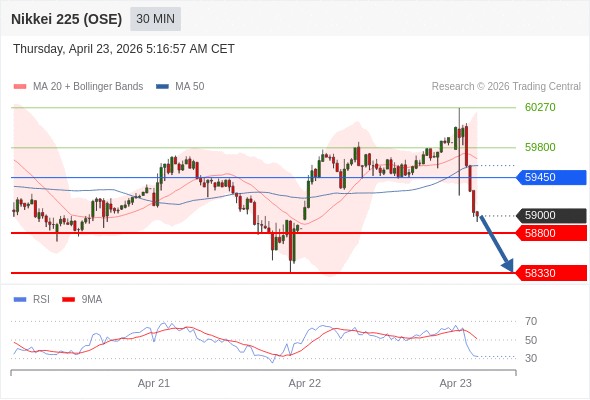 在 59450 之下,看跌,目标价位为 58800 ,然后为 58330 。
