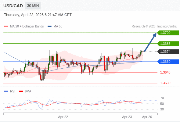 在 1.3660 之上,看涨,目标价位为 1.3685 ,然后为 1.3700 。
