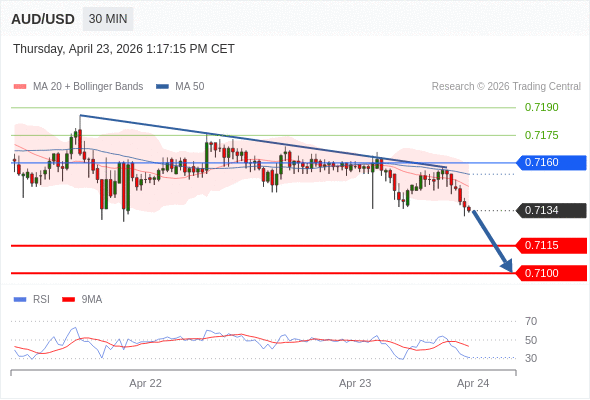 交易策略: 在 0.7160 之下,看跌,目标价位为 0.7115 ,然后为 0.7100 。