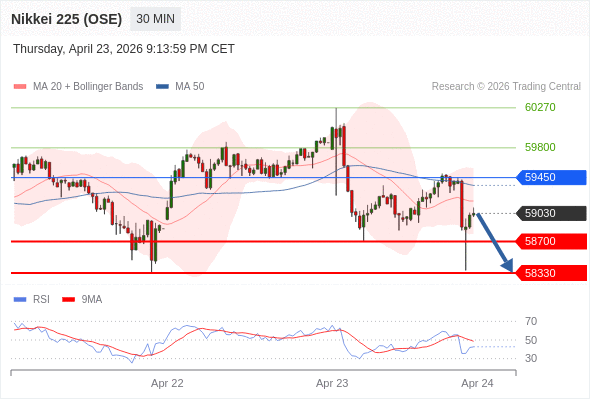 在 59450 之下,看跌,目标价位为 58700 ,然后为 58330 。