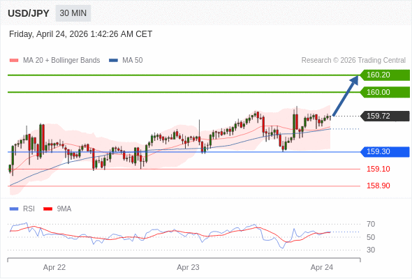在 159.30 之上,看涨,目标价位为 160.00 ,然后为 160.20 。