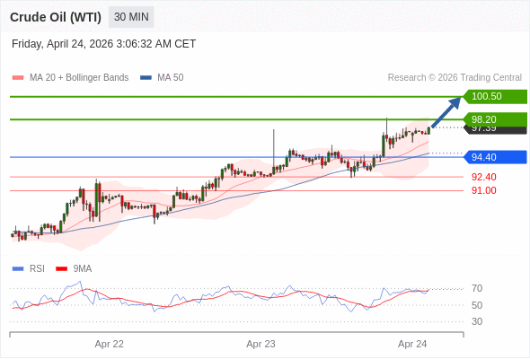 在 94.40 之上,看涨,目标价位为 98.20 ,然后为 100.50 。