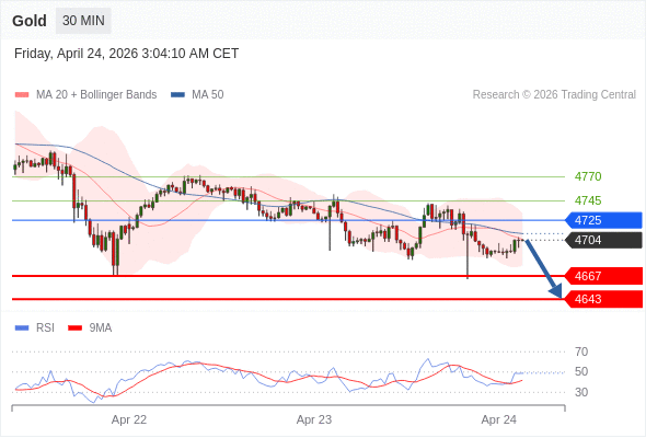 黄金现货 当日内: 短期关键阻力位在4725。