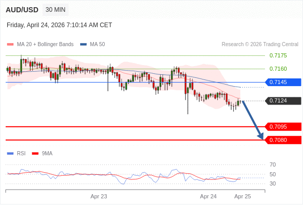 在 0.7145 之下,看跌,目标价位为 0.7095 ,然后为 0.7080 。