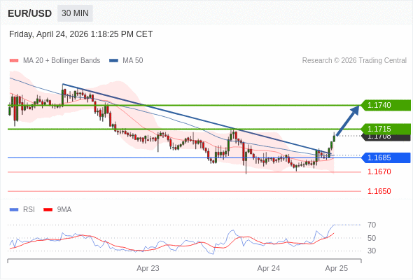 在 1.1685 之上,看涨,目标价位为 1.1715 ,然后为 1.1740 。