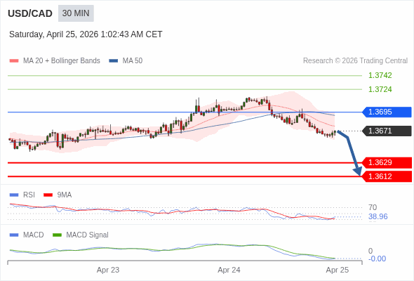 美元/加元 当日内 : 看跌,在 1.3695 之下。