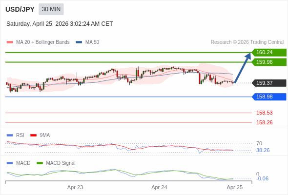 美元/日元 当日内 : 有上涨的可能,目标价位定在 160.24 。