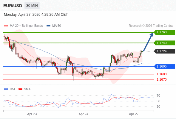 在 1.1695 之上,看涨,目标价位为 1.1740 ,然后为 1.1760 。