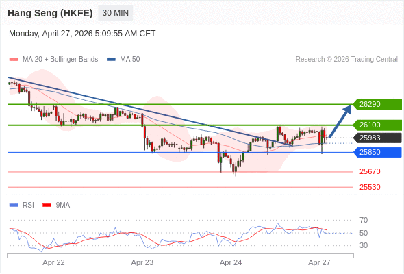 在 25850 之上,看涨,目标价位为 26100 ,然后为 26290 。