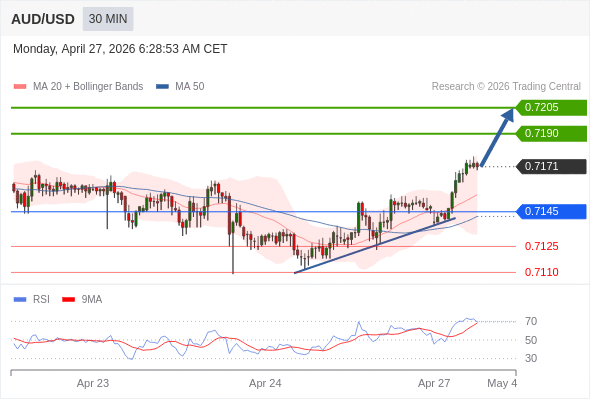 在 0.7145 之上,看涨,目标价位为 0.7190 ,然后为 0.7205 。