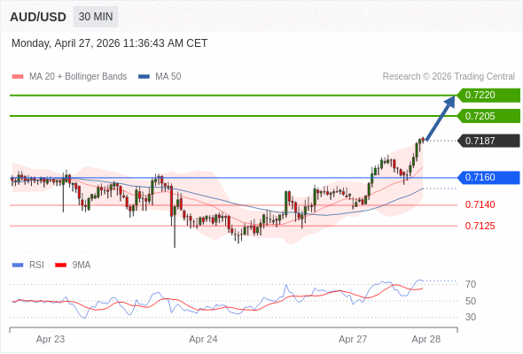 在 0.7160 之上,看涨,目标价位为 0.7205 ,然后为 0.7220 。