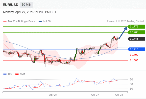 在 1.1715 之上,看涨,目标价位为 1.1760 ,然后为 1.1775 。