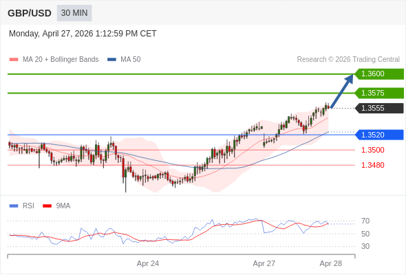 在 1.3520 之上,看涨,目标价位为 1.3575 ,然后为 1.3600 。