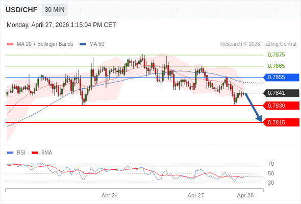 在 0.7855 之下,看跌,目标价位为 0.7830 ,然后为 0.7815 。