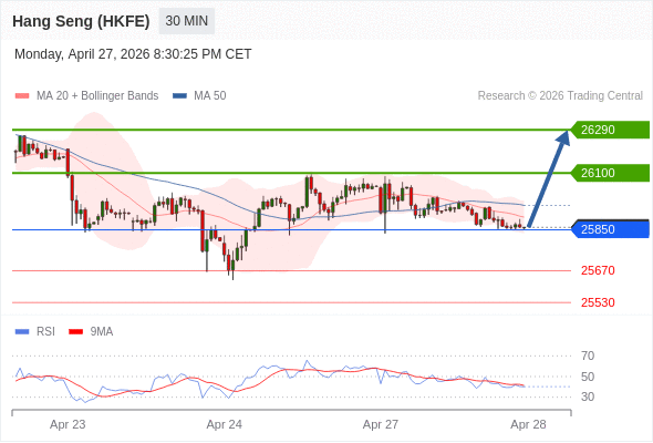 在 25850 之上,看涨,目标价位为 26100 ,然后为 26290 。