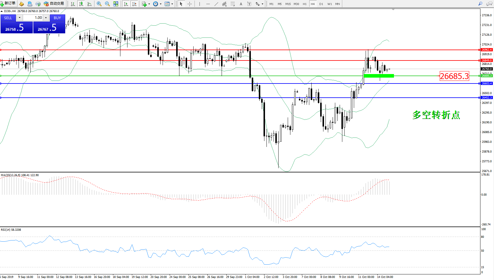 道琼斯指数DJ30—— 4小时K线图显示: