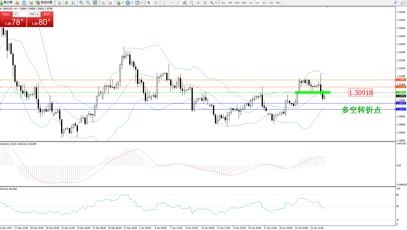 交易策略:1.30918下方看跌,目标1.30474、1.30222