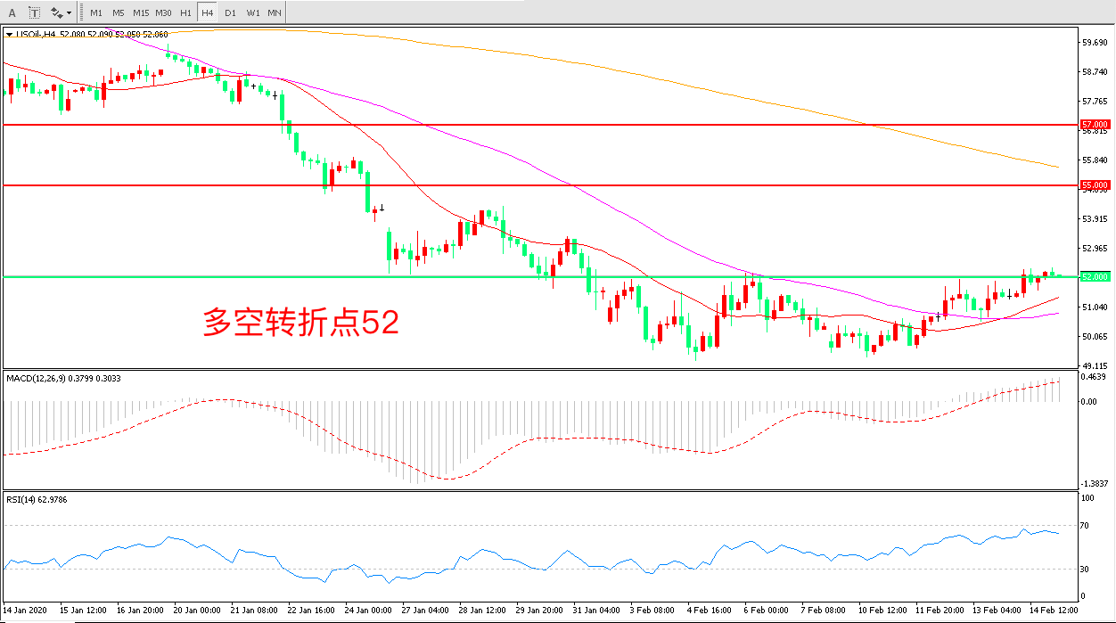 4小时图看,震荡企稳底部形态初现,52美金成为多空分水岭,整体走势有回暖迹象短期均线拐头向上MACD红柱增加RSI指标走平,日内震荡上行概率较大
