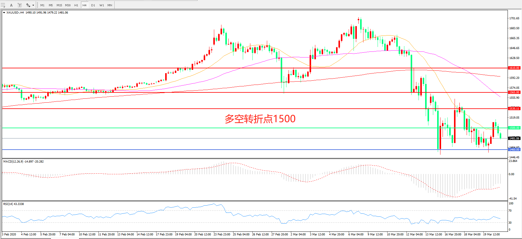 交易策略: 在 1500.00之下看跌,目标1460.00   1400.00