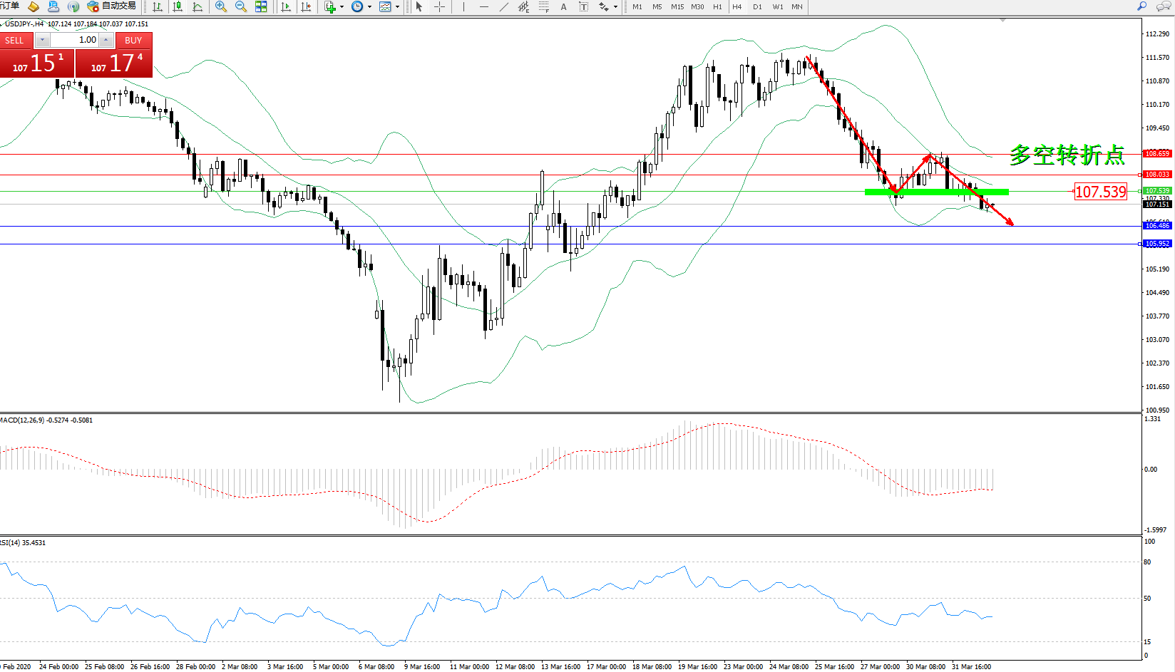 交易策略:107.539下方看跌,目标106.486105.952